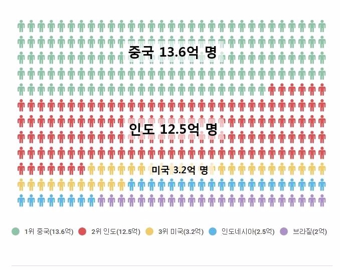 인구는 역시 중국이 1위인데 약 13.6억 명이다. 영어를 사용하는 국가가 106개 나라지만 인구 대국 중국을 뛰어넘지 못하는 걸 보면 중국의 인구가 얼마나 많은지 알 수 있다. 2위인 인도 역시 12.5억 명으로 인구수가 중국과 큰 차이가 나지 않는데, UN에서는 2022년에 인도 인구가 중국을 넘어설 걸로 예측하고 있다. 다만 인도는 40%를 차지하는 힌디어 외에도 공용어가 14개라서 실제 힌디어 사용자는 약 2억 6700만 명으로 언어 사용자 수로는 힌디어가 4위다. 우리나라의 인구는 약 5155만명으로 26위이고, 언어 사용자수 12위 보다는 조금 아래다.