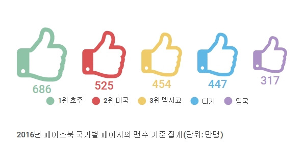 전 세계적으로 어느 나라가 인기가 많은지는 객관적으로 알기가 쉽지 않다. 세계 주요 나라마다 페이스북에서 홍보하고 소개하는 페이지를 운영하는데 이 페이지의 팬 수로 추정을 해 볼 수도 있다. 페이스북의 사용자수가 전 세계에 약 16억 명(2015년 4분기 월 사용자)이니 그 사람들의 취향이 반영된 자료라고 볼 수 있다.(물론 참여자 수도 세계 인구 대비 적고, 같은 국가 내 일부 지역 중복, 홍보 활동에 따른 차이 등의 한계도 있다)