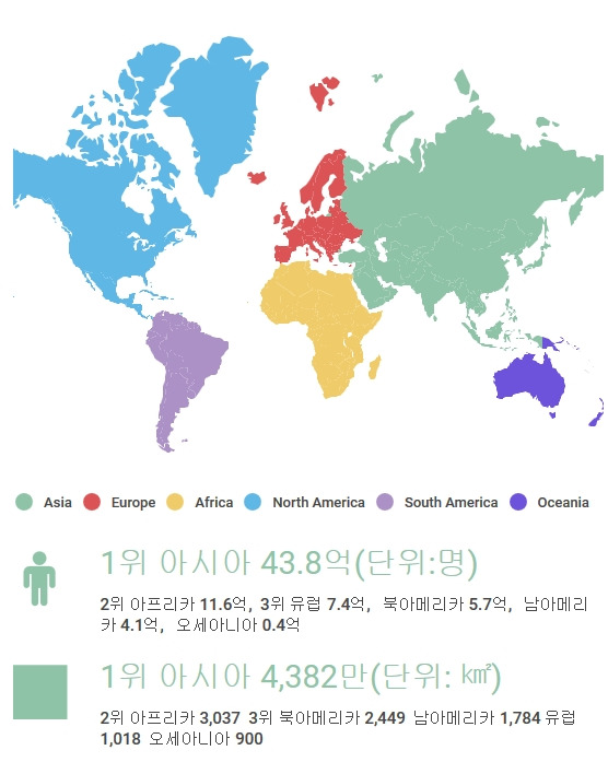 아시아가 면적 4,382만 km²(남한의 약 440배), 인구 43.8억 명(남한 인구의 약 85배)으로 제일 넓고 사람도 많다.