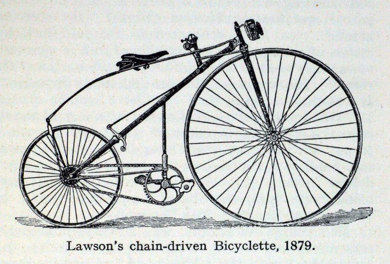 최초의 체인식 자전거는 1879년 영국의 핸리 로슨이 만들었다. ‘벨로시페드’는 앞바퀴에 페달이 달려 있어 발로 굴리면서 방향 조정을 하기가 어려웠고 이를 개선하기 위해 나온 게 체인식 자전거다. 바퀴가 아닌 자전거 중간에 페달이 있고이 페달은 뒷바퀴의 체인이 연결되어 앞바퀴와 상관없이 동력을 전달해 효율적으로 자전거를 탈 수 있게 해주었다. 사실상 오늘날의 자전거와 거의 유사한 형태라고 볼 수 있지만 ‘바이시크릿’이라는 이름을 가진 이 자전거는 상업적으로 성공하진 못한다.