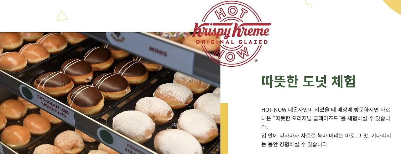 '크리스피 크림 도넛'은 오픈 당시 아주 생소한 브랜드 커뮤니케이션으로 유명했습니다. 바로 'HOT NOW 네온사인'인데요. '크리스피 크림 도넛'의 시그니처 제품은 '오리지널 글레이즈(Original Glazed)'입니다. 오리지널 글레이즈가 오븐에서 구워져 나오는 시간을 'HOT NOW 네온사인'이라고 합니다. 바로 이 시간에 매장에서 공짜로 소비자에게 오리지널 글레이즈를 1개씩 제공하는 마케팅을 'HOT NOW 네온사인'이라고도 하죠. 또한 고객들은 무료로 받은 도넛을 먹으면서 매장 안에서 기계로 도넛이 만들어지는 과정을 투명한 유리창을 통해 직접 보면서 간접적인 제빵을 경험할 수도 있습니다. 그래서 오픈 초기 'HOT NOW 네온 시간'이 되면 '크리스피 크림 도넛' 매장은 항상 줄을 서서 기다리는 장사진을 이루곤 했었습니다.