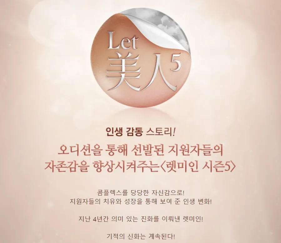 이번에는 성형과 관련된 이야기를 해보겠습니다. 2012년부터 15년까지 스토리온 O tvN 케이블 방송에서 방영된 'Let미인'이라는 오디션 프로그램이 있었습니다. 성 상품화등 여러 가지 논란이 있는 프로그램이었지만 방영 초기의 인기에 힘입어 시즌 5까지 진행된 오디션 프로그램입니다. 이 프로그램은 외모 콤플렉스 때문에 육체적, 정신적 고통을 받는 사람들이 오디션에 출전해 성형수술을 받고, 메이크업 아티스트, 스타일 리스트, 헤어디자이너의 도움을 받아 신데렐라가 되는 과정을 보여주는 리얼 버라이어티쇼였습니다.