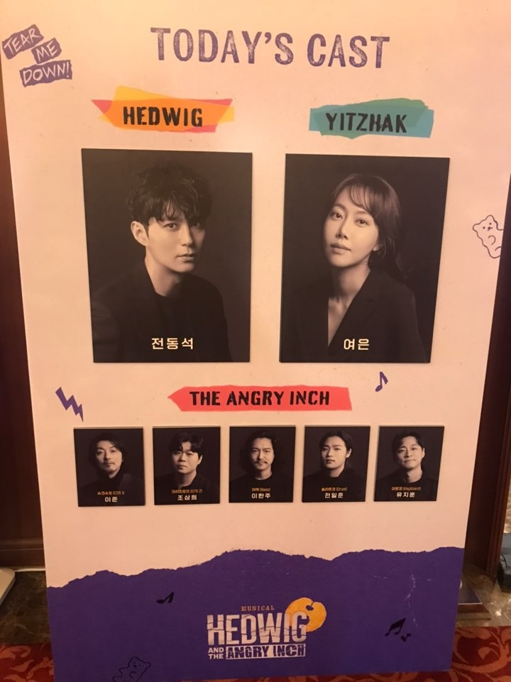 그래서 꽤 오랫동안 뮤지컬도 한 번 보고 싶다고 생각했었다. 조승우의 헤드윅을 보고 싶었지만 티켓팅에 성공할 열정이 없었다. (조승우는 톤과 상관없이 그냥 조승우면 된다. ^^. 그는 연기가 접신같아서. 하.. ) 우연히 헤드윅이 공연 중인것을 알게 되어 갑자기 잠실까지 가서 헤드윅을 보고 왔다. 남편이 쉬는 금요일에 유연석의 헤드윅을 볼까 했지만, 전동석의 헤드윅을 보기 위해 화요일에 혼자 보고 왔다. 나는 유연석이나 조정석 스타일의 보컬을 주관적으로 좋아하지 않는다. 약간 얇은 하이톤보다는 중저음의 파워풀한 톤을 좋아하는데 전동석이 그랬다. 내 선택은 나에게 딱 맞았다. 내 취향을 맞추기 위해 혼자 가야 했고, 편한 자동차 대신 버스와 지하철을 갈아타고 가야 했지만 만족스러웠다. 기대하지 않은 이츠학 역의 여은이 노래를 너무 잘해 깜짝 놀랐다. 우리나라에는 어떻게 이렇게 노래 잘하는 사람이 많은지 매번 놀란다. 통나무 같은 내가 의자에 딱 붙이긴 했지만 너무 신나서 상체를 흔들 정도로 공연은 신났다. 전동석은 노래만 잘하는 게 아니라 완전 잘생기고 멋짐 뿜뿜이었다! 다리는 또 어찌나 길고 예쁜지 깜짝 놀랐다. 하지만 전동석은 결핍과 불완전이 가득한 헤드윅을 하기에는 너무 온전하고 행복해보여 이입이 잘 안됐다. (헤드윅 공연 전에 열애기사가 빵 났고 이번주에 결혼기사가 떴.. )