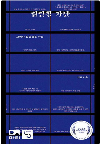 최근 읽은 안온의 <일인칭 가난: 그러나 일 인분은 아닌> 은 20년을 국민기초생활수급자로 임대주택에 살며 술에 빠져있던 아버지의 폭력을 견디던 작가의 현실적인 삶이 녹아있는 책이다. 결국 살기 위해 도망 나온 모녀를 보란 듯이, 딸의 방에서 번갯불을 피워 자살한 아버지와 글을 쓰고 싶었지만 살기 위해 학원강사로 밤낮없이 일했던 작가의 경험이 들어있었다. 기형도의 슬픔과는 다른, 어쩌면 분노에 가까운 그 정서가 안타까웠다.
