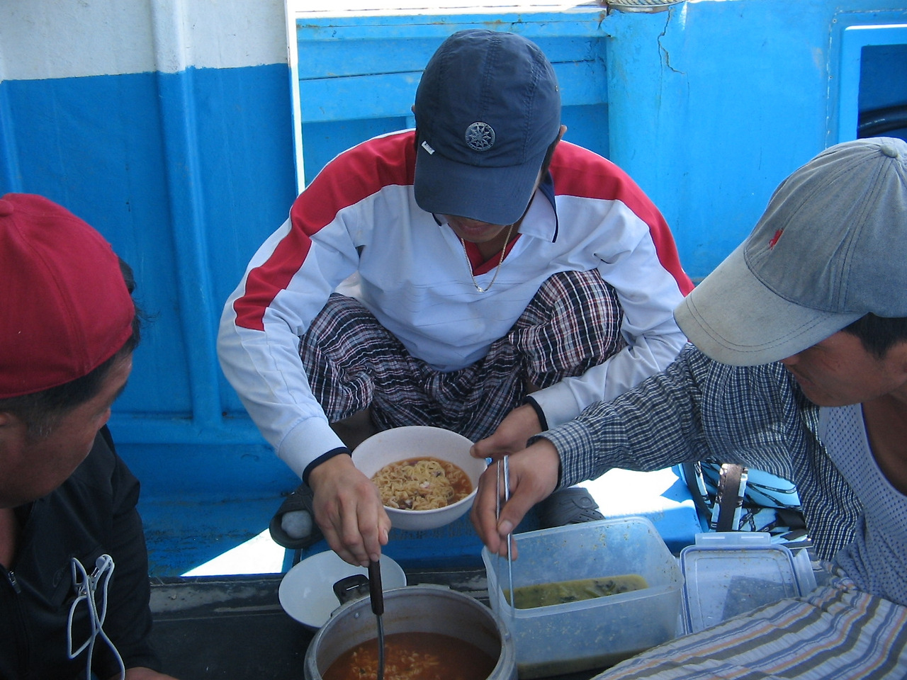 배에서 제일 어린 총각이 문어가 잔뜩 들어간 맛난 라면을 끓여줬다. 우리는 2리터짜리 패트병에 든 소주를 맥주컵에 나눠마셨다. 선장님 다음으로 준 내 라면 그릇에 특별히 많은 문어가 들어있었다. 라면과 함께 소주를 꿀꺽꿀꺽 마시는데 취하지 않았다. 흉터의 사나이는 두 아이의 아버지였고, 빨간 모자의 질문이 많은 아저씨는 여수가 집이고, 날 구해준 파란 옷(정확히는 파란 줄무늬 셔츠) 아저씨는 술을 전혀 못 마시는 노총각이었다. 선장님께 원래 배에 아무나 태워 오면 안 되는 거라는 훈계를 한 차례 듣고, 문어배의 아저씨들과 이런저런 얘기를 했다. 막내 총각이 자꾸 내가 간첩일 거라고 해서 신고하면 로또라고 좋은 기회를 놓치지 말라고 농담을 건넸다. 빨간 모자 아저씨는