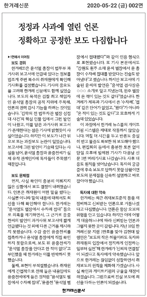 책임 있는 언론을 지향하는 한겨레는 이 기사의 정확성을 스스로 평가하고, 취재보도 과정의 문제점도 살펴 독자에게 투명하게 알리기로 했습니다. 이를 위해 4월 초 구성된 ‘윤석열 관련 보도 조사 티에프’(팀장 백기철 편집인)는 한겨레가 언론활동의 기준으로 삼는 취재보도준칙에 비춰, 이 기사가 사실 확인이 불충분하고, 과장된 표현을 담은 보도라 판단했습니다. 정확하지 않은 보도를 한 점에 대해 독자와 윤 총장께 사과드립니다.