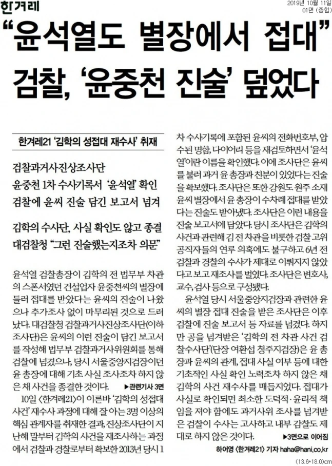 <한겨레>는 2019년 10월 11일 치 1면과 온라인에 ‘“윤석열도 별장에서 수차례 접대” / 검찰, ‘윤중천 진술’ 덮었다’는 제목 아래 “윤석열 검찰총장이 김학의 전 법무부 차관의 스폰서였던 건설업자 윤중천의 별장에 들러 접대를 받았다는 윤 씨의 진술이 나왔으나 추가 조사 없이 마무리”됐다는 보도를 했습니다. 주간지 <한겨레 21> 1283호(10월 21일 치)도 ‘윤중천 “별장에서 윤석열 접대했다”’는 제목 아래 표지이야기로 같은 내용을 보도했습니다.