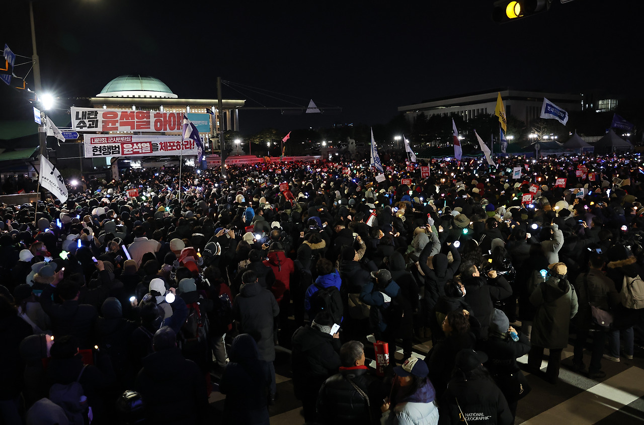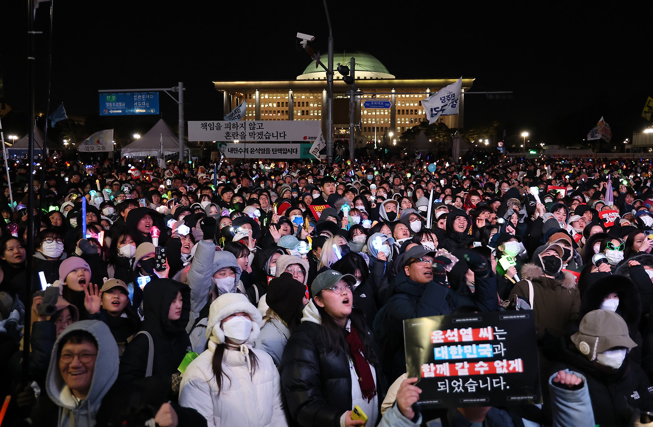 표결은 무산됐다. 국민의힘 의원들이 단체로 퇴장했기 때문이다. 그 이후에도 시민들은 국회 앞에 남았다. 우리 팀원이 국회 앞을 청소하는 사람들을 인터뷰했다. 국힘의힘 쪽에서 또 시위에 나선 이들의 처절한 시민의식이라고 비판하는 것을 차단하기 위해 시위의 흔적을 치우고 있다고 했다. 시위에는 문제집을 들고 온 고3 수험생과 수능을 끝내고 참석한 젊은이들이 많았다. 좋아하는 아이돌 응원봉을 든 친구들도 다수였다. 남녀노소 할 것 없이 윤석열 퇴진을 외쳤다. 이 와중에도 당의 안위만 생각하는 국힘 의원들 탓에 탄핵 열차는 일단 멈춰섰다. 곧 다시 움직일 터다.