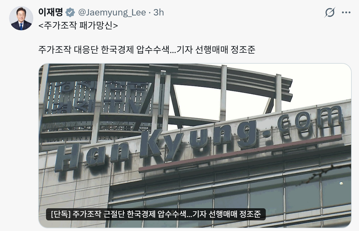 이재명 대통령은 한국경제신문의 일부 기자가 ‘선행매매’로 압수수색을 당했다는 기사를 공유하며 “주가조작 패가망신”이란 메시지를 남기기도 했습니다. 참 난리입니다.