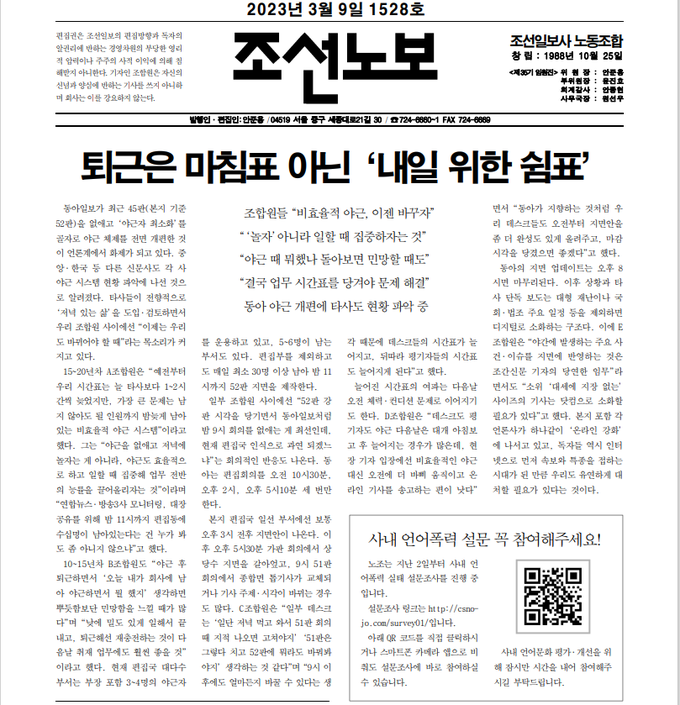이런 내용이었는데요. 조선일보 기자 여러명에게 물어보니 안타깝게도 별로 변한게 없다고 합니다. 여전히 다들 힘들게 일하고 있고요.