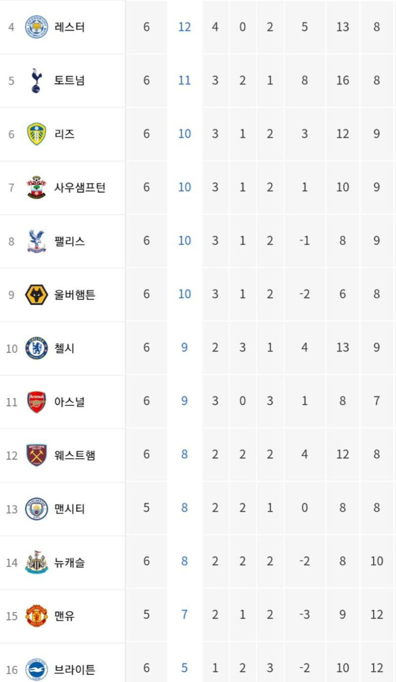 첼시 10위, 아스널 11위, 맨시티 13위, 맨유 15위. 시즌 초반이라지만 그동안 보기 힘들었던 순위표다.