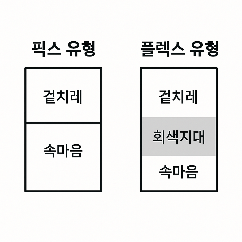 플렉스 유형인 사람은 회색지대 때문인지 겉치레와 속마음이 명확히 구분되지 않는 사람이기 때문이다. 이에 반해 플렉스 유형인 사람이 픽스 유형의 사람을 '융통성이 없다.'고는 생각하지만 딱히 부정적으로 판단하는 경우는 드물다.