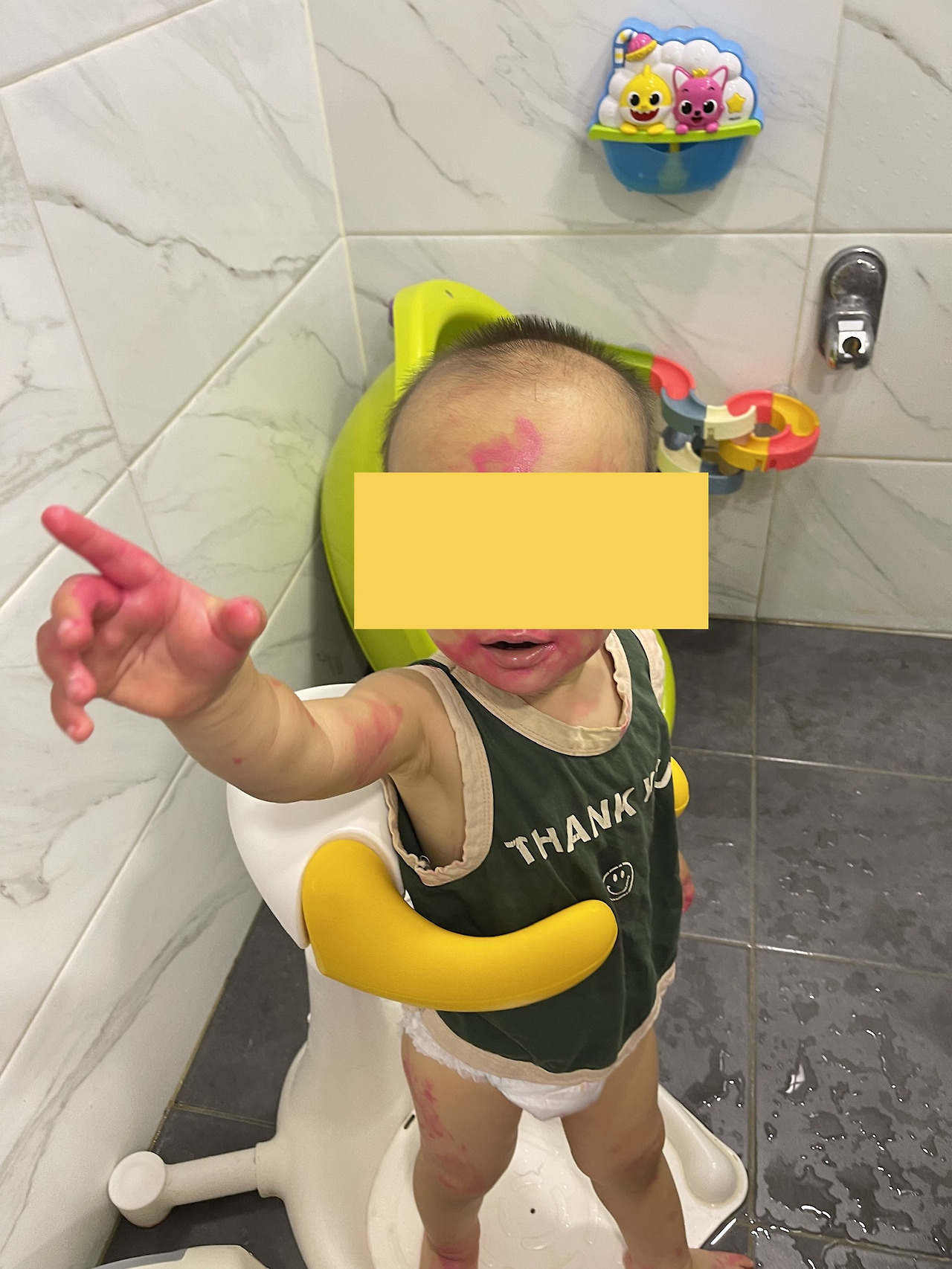 립스틱을 먹으며 만족스러운 웃음을 짓는 아기. 그뿐만이 아니었어요. 안방의 벽지에는 피카소 못지않은 낙서가 칠해졌고요. 아기의 얼굴은 조커 뺨치는 분장이 되어 있었어요. 요즘 립스틱 성능 참 좋더라고요. 비누로 문질러도 지워지지 않아 겨우 겨우 지웠습니다.