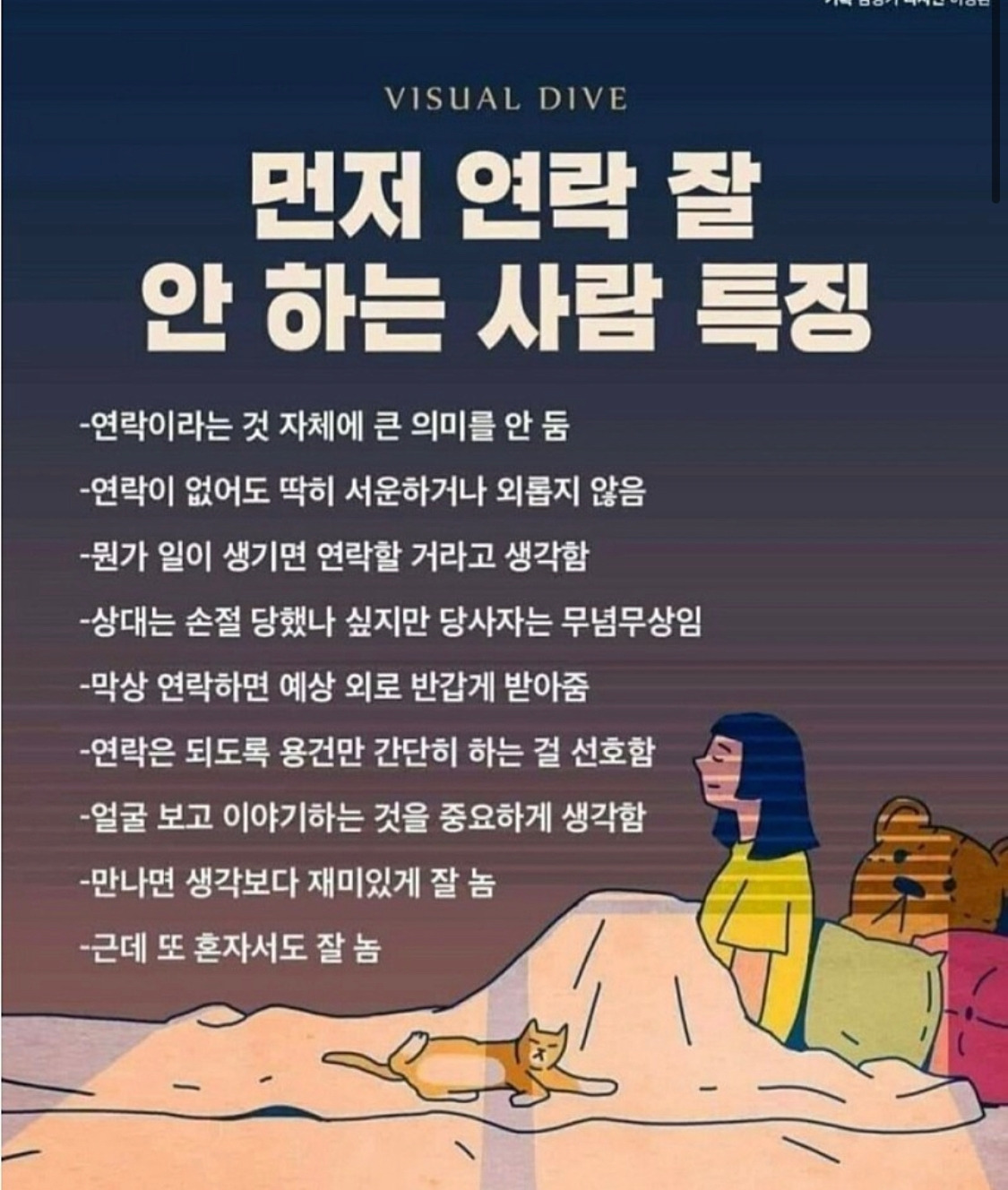 오늘은 연락을 잘 안 하는 사람의 특징을 공유해보았습니다. 쓰면서 너무 주절주절 제 말도 길었네요. 이 글을 읽는 모든 분들 행복한 하루 보내세요. ^^