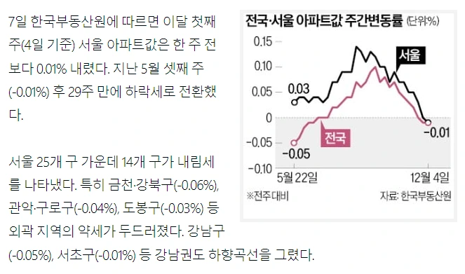구체적으로 살펴보면 서울 25개 가운데 14개 구가 내림세였는데요. 특히 그전, 강북구(-0.06%), 관악, 구로구(-0.04%), 도봉구(-0.03%) 등 외곽지역의 약세가 두르러졌다고 합니다.