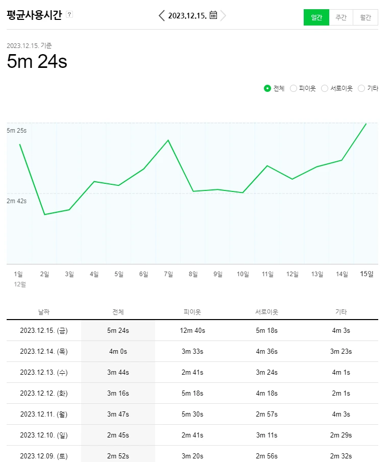 공감수가 적었던 최근 이틀 동안 체류시간은 늘어났습니다. 공감수가 적다는 건 그만큼 방문자 수가 적다는 건데요. 최근 체류시간이 늘고 있는 것으로 보아 찐 이웃들이 방문해 주신 것 같습니다.