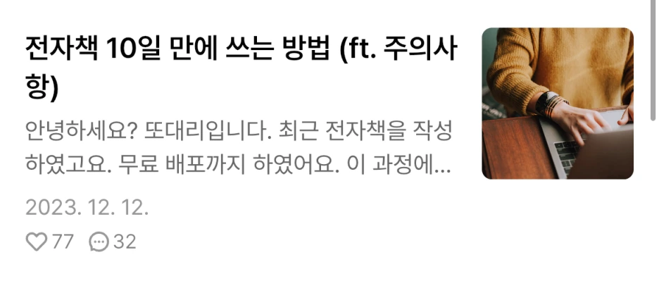 위의 글은 최근 글 중 공감수가 가장 적은 글입니다. 이유는 전자책에 관심이 없으신 분들이 많으십니다. 전자책을 쓰려고 마음먹은 분들만 대상으로 쓰다 보니 타깃층이 좁고 뾰족했습니다.
