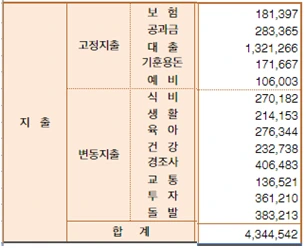 - 포함 내용 : 남편 월급, 성과급, 아내 월급, 성과급, 아기 양육수당, 육아수당, 용돈, 중고거래 수익, 아기용돈, 치료 환급금, 주식투자수익