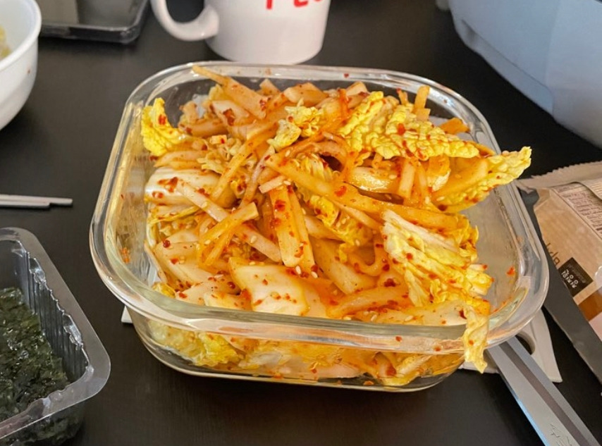세 번째 반찬은 무나물이에요. 이번 가을부터 무나물을 참 맛있게 만들어 먹었어요. 왜냐면 가을무가 약이라는 말이 있대요. 그만큼 제철 음식이라 그런가 봐요. 이런 무를 저는 친정엄마가 한 덩이 주셔서 한동안 잘 먹었어요. 그런데 마트에 가도 반토막에 천 원대에 팔고 있더라고요. 무는 반토막만 있어도 충분히 무나물을 많이 만들 수 있어요. 이 무나물을 갓 했을 때 밥에 들기름 둘러서 먹었어요. 꿀떡꿀떡 밥이 잘 들어가더라고요. 소화도 참 잘되어서 만족한 반찬이에요. 사진이 없어서 대신 배추와 무로 만든 겉절이 사진으로 대체했어요. 인터넷에 무나물을 검색하면 만드는 방법까지 잘 나와 있어요.