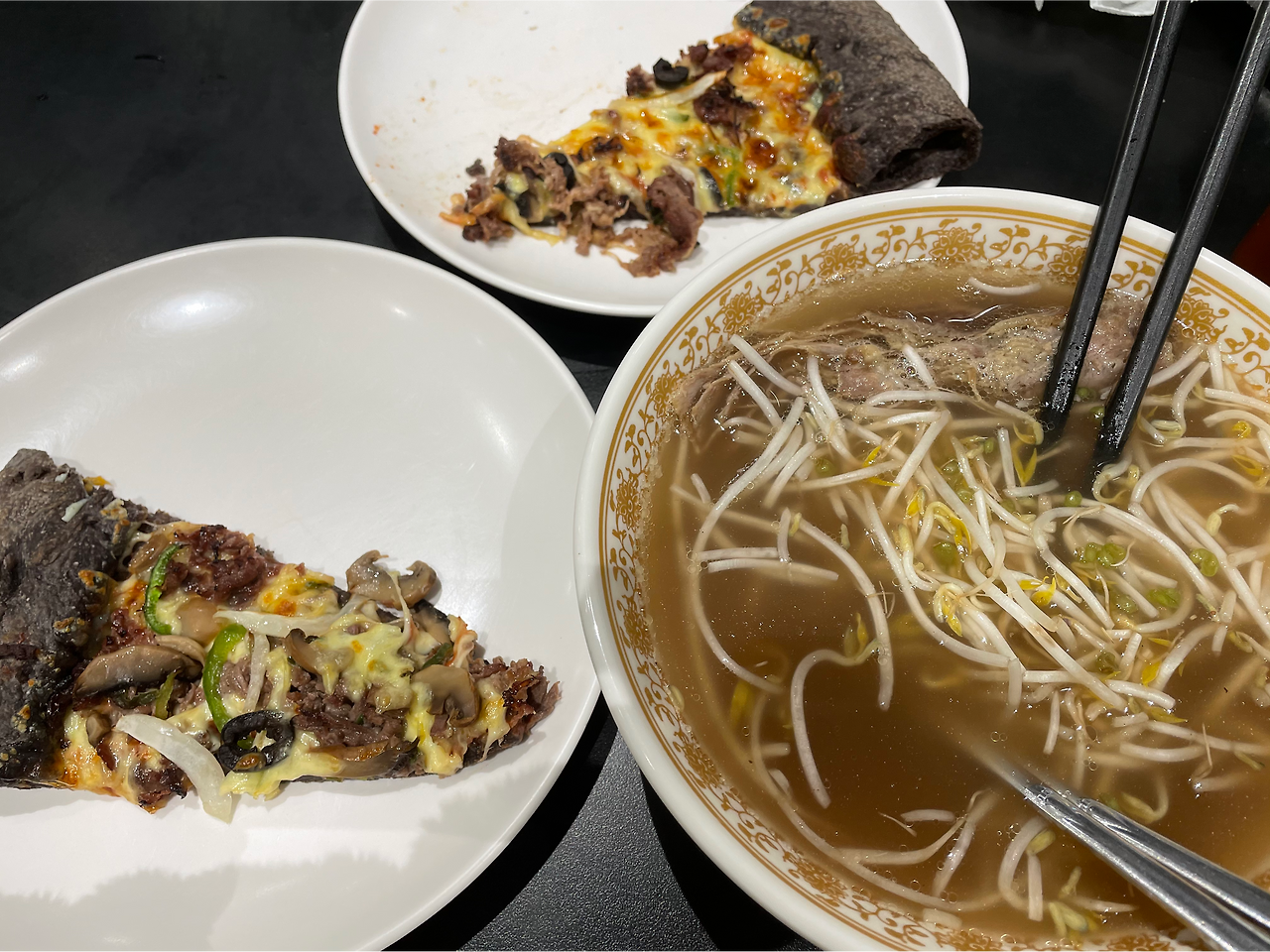 귀여운 아기를 키우다 보면 정말 행복하지만요. 가끔 저녁에는 힘이 쪽 빠질 때가 있어요. 체력적으로 힘이 들어서 그런가 봐요. 그럴 때는 저녁 메뉴를 생각하고 만들기가 귀찮은 거 있죠~. 그래서 가끔은 외식을 하고 싶어요. 그럴 때 가끔 가는 곳이 있어요. 대형마트 근처에 저렴한 가격으로 빨리 먹을 수 있는 곳이에요. 쌀국수는 5500원, 피자는 한 조각에 3500원이에요. 음료수는 500원이고요. 그래서 남편과 함께 쌀국수 1개, 피자 1개, 음료수 1개 이렇게 시켜요. 그럼 9500원으로 빠르고 간편하게 저녁 한 끼를 해결할 수 있어요. 물론 근사한 분위기는 아니에요. 그러나 아기가 어려서 빨리 나오는 음식이 좋은 저희 가정에는 안성맞춤이에요.