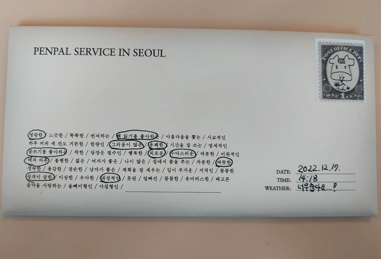 내 편지를 선택하실 분에게 내 정보를 알릴 수 있도록 편지 봉투에 나를 설명하는 여러 수식어를 골라 동그라미 쳤다. 명랑한, 책 읽기를 좋아하는, 예의가 바른, 수다스러운 등 남들에게 보여주고 싶은 나의 모습들이다. 몇 가지 고민했던 수식어는 '착한, 이상한, 얼빠진, 유머러스한'. 스스로를 착하다고 말하는 사람 중에 진짜로 착한 사람은 본 적 없기에 '착한'은 패스. '이상한, 얼빠진'은 맞는 말이지만 편지 쓴 사람을 수상하게 여겨 내 편지가 그 누구의 선택도 받지 못할까 봐서 기각했다. 유머러스하면 좋겠지만 막상 웃기길 기대하고 읽은 편지가 노잼이면 실망하실 테니 안되겠다. 적당히 걸러진 자기소개와 함께 우표 스티커에는 내가 밀고 있는 소 캐릭터를 그려 넣었다. 그 뒤 날짜, 시간, 날씨를 채웠다.