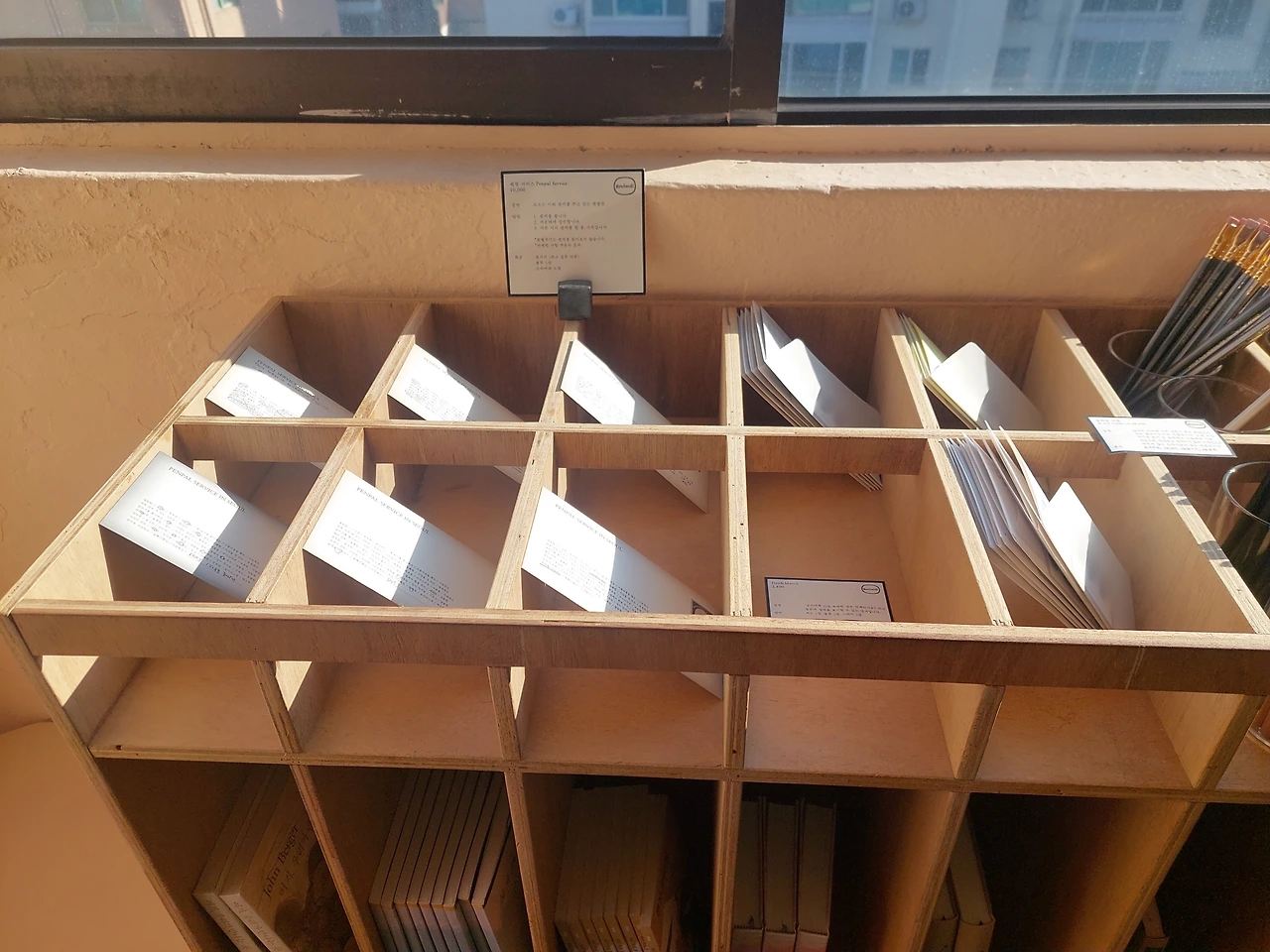 상점 글월은 1층 피터팬1978 빵집이 있는 건물의 4층에 있다. 글을 쓰면서 알았는데 수요미식회에도 소개된 유명한 빵집이란다. 오래되고 썰렁한 건물은 빵집의 고소한 버터 냄새로 가득했다. 잘못 찾아온 게 아닐까 싶을 정도로 허름한 건물이지만 계단을 올라가면 정말 4층에 편지 가게가 있다. 문 여는 시간에 맞춰 방문한 상점은 참 작았다. 3-4사람만 있어도 꽉 차게 느껴질 정도다. 다행히 좁은 공간 덕분에 빠르게 난방이 되어 맹추위에도 실내는 아늑했다. 작디작은 공간이지만 제품을 진열한 매대와, 한쪽에는 앉아서 편지를 쓸 수 있도록 구색을 갖춘 의자와 테이블이 있다.