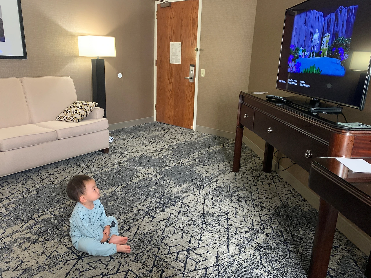무료 숙박권 덕분에 공항 근처 스위트룸에서 머물 수 있었다. 낯선 환경이지만 집에는 없는 소파도 있고 티비도 있고 누르면 소리 나는 금고도 있기에 루하는 신나서 하이퍼엑티브 모드로 호텔방을 날아다녔다. 매일 보던 아기이지만 오늘 밤이 마지막이라는 생각이 드니까 루하의 모든 행동을 눈에 담아두고 싶었다. 한국에서 영상 통화로 매일 보겠지만 직접 보는 것과는 차원이 다르니까.