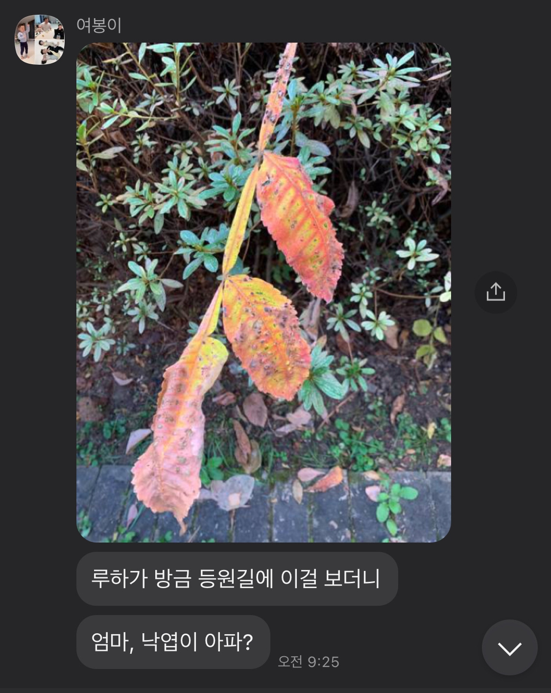 낙엽이 아프다니.. 생각지도 못한 표현이었다. 아내랑 자주 얘기하는 게 루하는 의도하진 않았겠지만 표현들이 참 서정적이라는 것이다. 아이의 순수함에서 나온 표현들이겠지만 때론 깜짝깜짝 놀랄 때가 있다. 내가 농담으로 윤동주가 아닌 서동주라고 부른다. 나중에 커서 별 헤는 밤을 찾아다닐지 누가 아나.