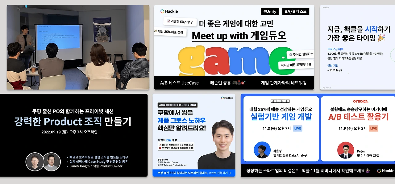 진행한 행사의 횟수만큼, 가장 많이 진화했던 나의 프로젝트. 광고도 행사 기획도 발표자료도 타겟도, 행사를 진행하면서 점차 고도화해나갔다. 행사의 제목은 최대한 한 번에 정하는 것을 지양했다. 여러 가지의 소구점을 광고로 선 테스트해보고, 메인 포스터와 행사 카피를 잡아서 커뮤니티 및 여러 채널들에 뿌리는 형태로.