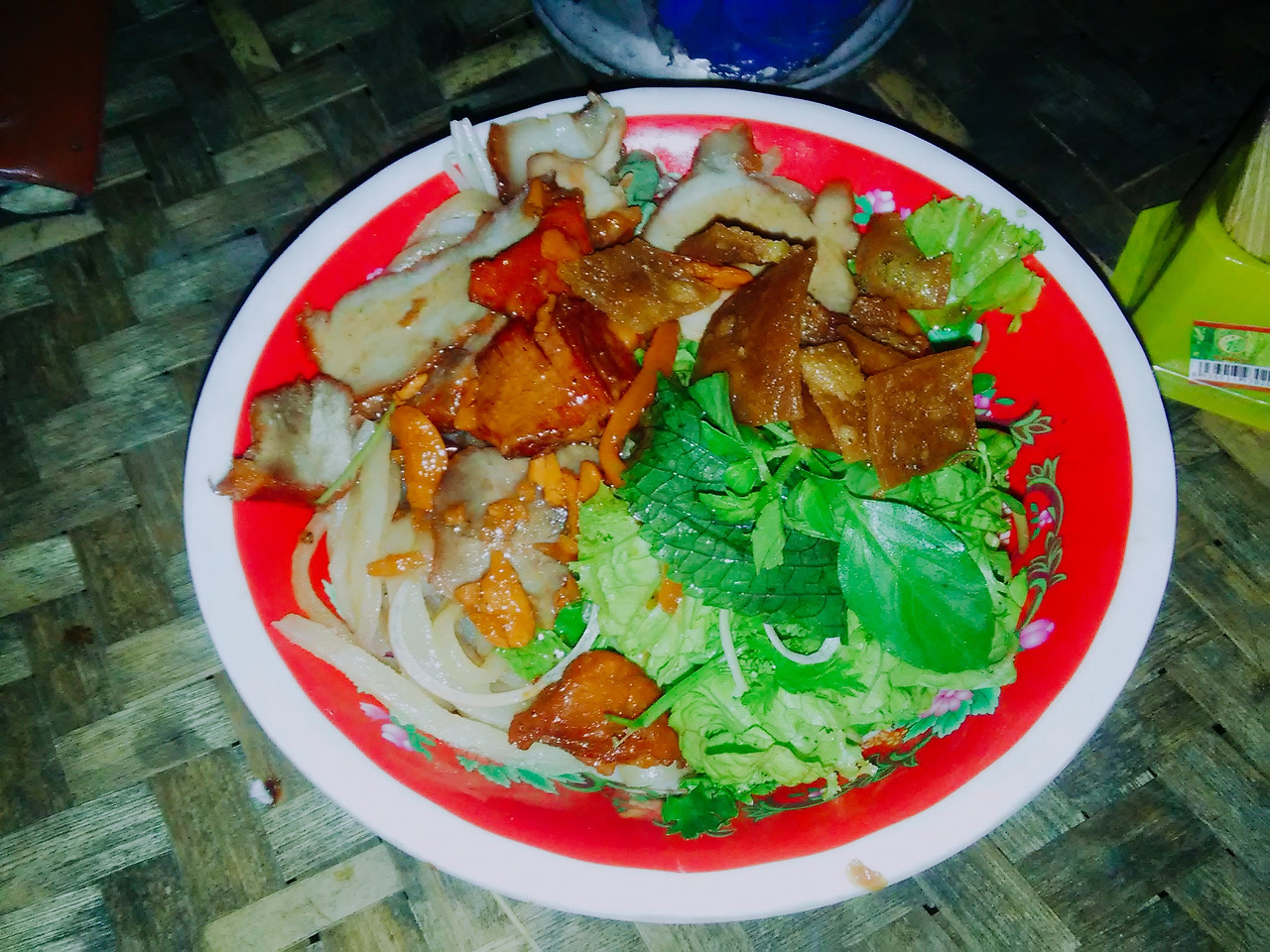 면과 돼지고기와 돼지껍데기 튀김,