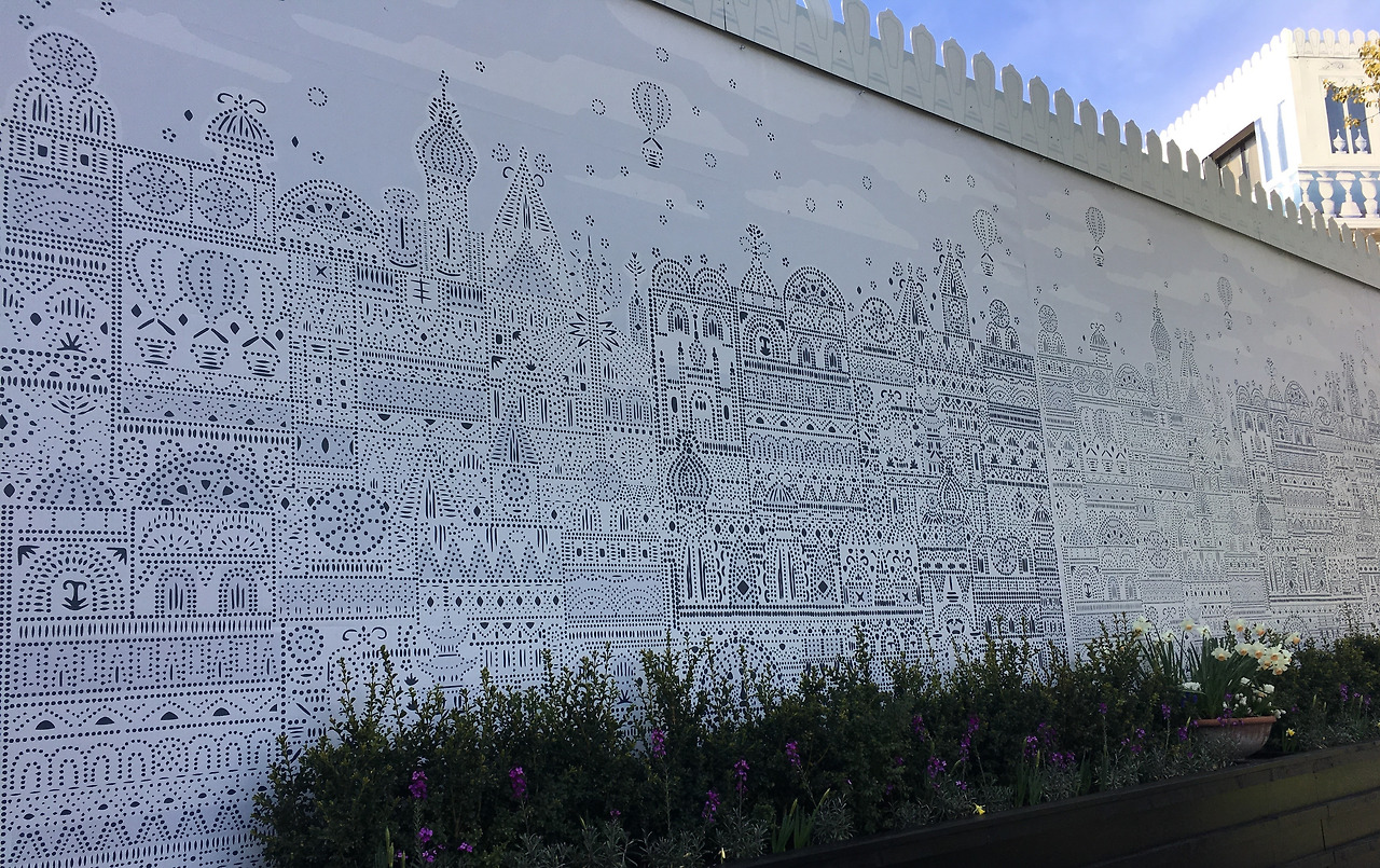 금방이라도 백마 탄 왕자와 아름다운 공주가 걸어 나올 것만 같은 새하얀 궁전 앞에서 만난 흰색의 담벼락에는 점으로 그린 티볼리의 아름다운 모습이 담겨있었는데, 밤에 보는 반짝이는 조명의 티볼리의 모습처럼 화려하고 아름다워 감동스러웠던 기억이 난다. 라인드로잉을 점으로 표현해서 작은 전구들이 일제히 켜지는 티볼리의 밤의 모습을 어둡지도 않고, 다양한 색도 쓰지 않으면서 그 어떤 야경보다 화려하게 표현하고 있었다.