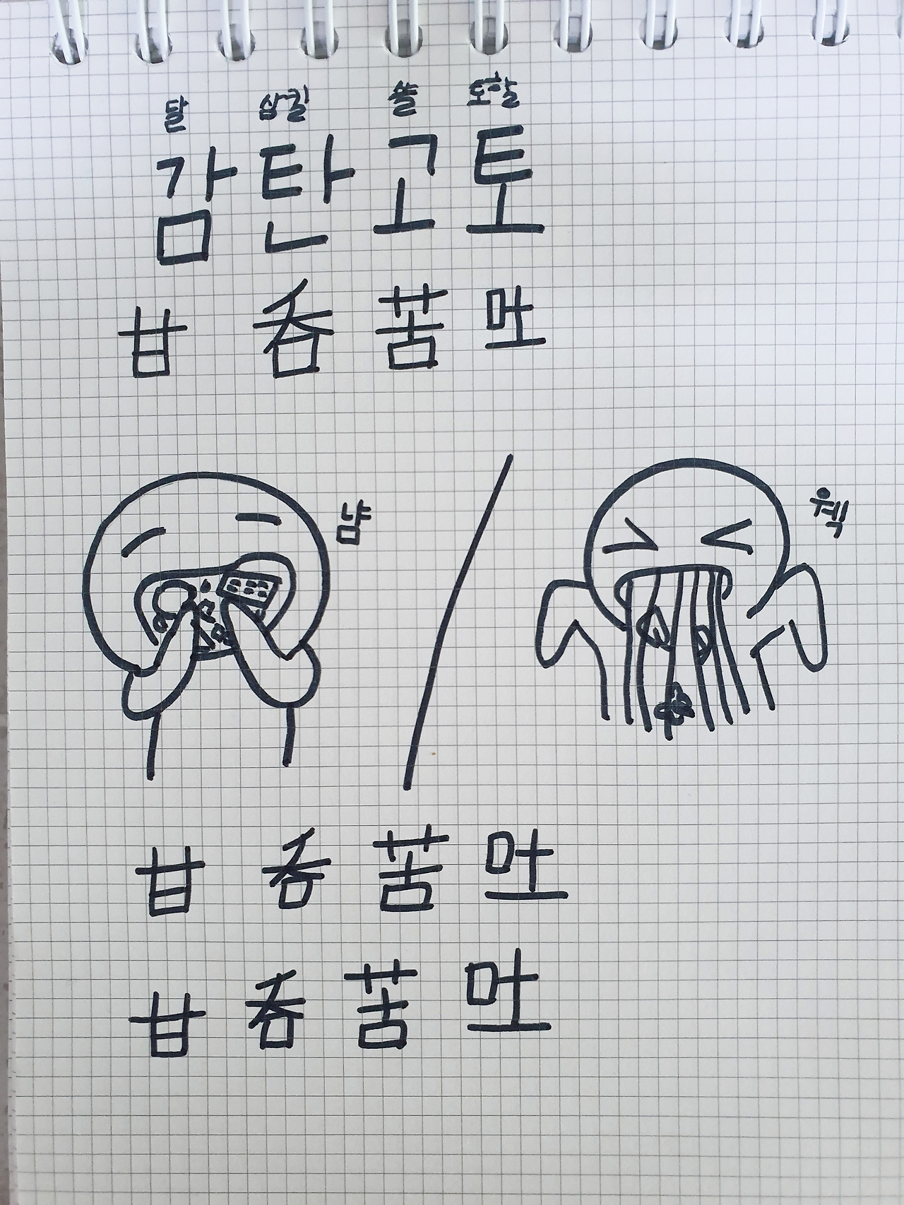 책에 있는 순서대로 공부를 시작할꺼라는 나의 예상과 달리 딸은 책의 중간에서 맘에 드는 사자성어를 하나 골랐고 딸의 첫 사자성어는 '감탄고토(甘呑苦吐)'였다.