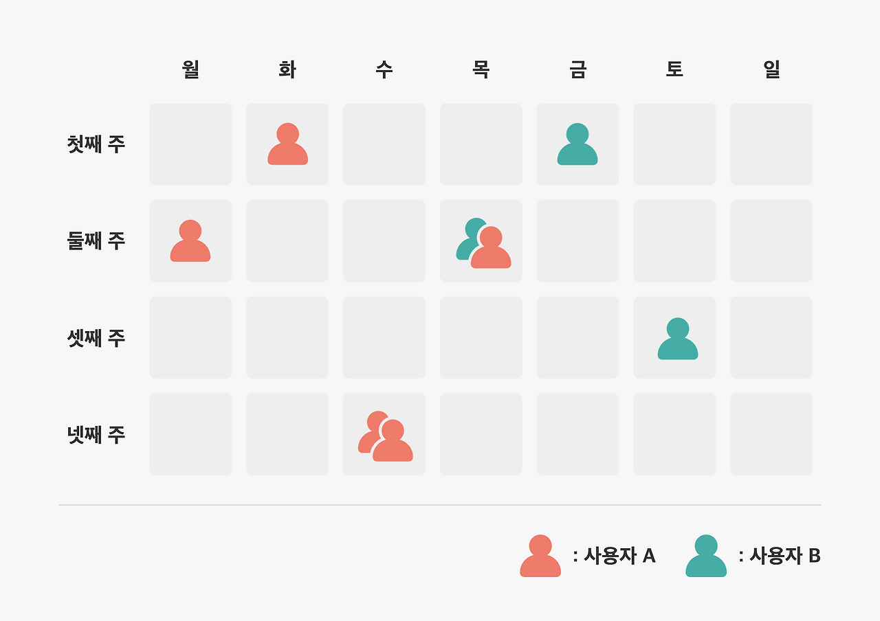 하루 동안 3개의 세션이 발생했다 하더라도 동일한 user ID로 발생한 것이라면 DAU는 1이다. 예를 들어 [그림 1]에서 둘째 주 목요일과 넷째 주 수요일은 동일하게 2개의 세션이 발생했다. 전자의 DAU는 2로 세션 수와 일치하지만, 후자는 사용자 A가 두 번 접속한 것이기 때문에 중복 세션을 제거하면 DAU는 1이 된다.