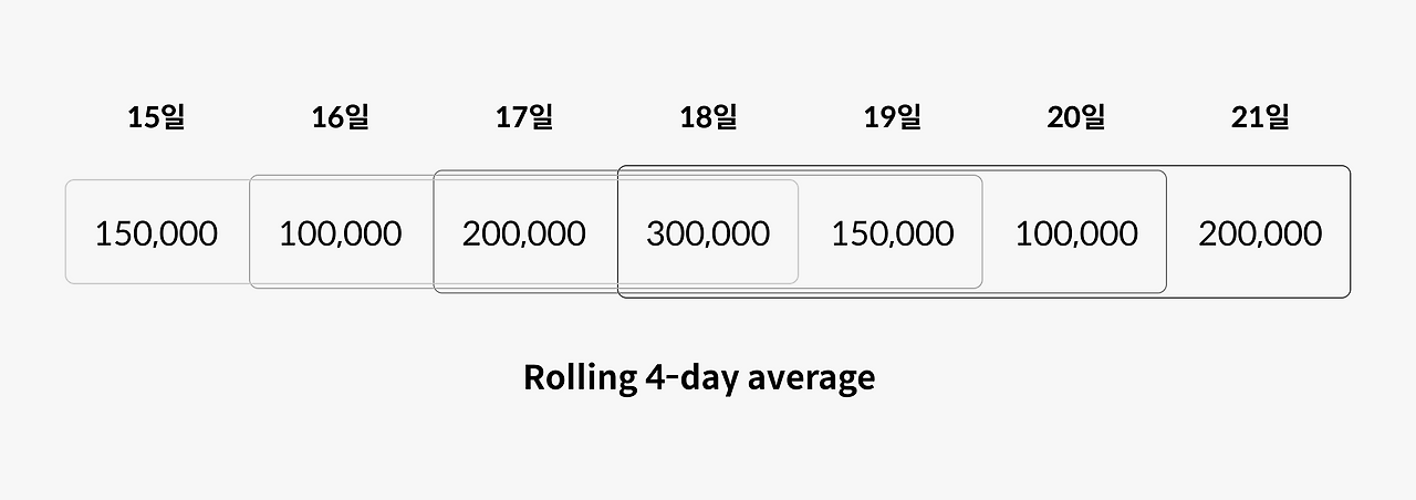 Rolling metrics는 보통 rolling 4-day average 같은 형태로 특정 기간에 대한 평균값으로 사용한다. Rolling 4-day average라고 하면, 4일에 대한 평균값을 추적하는 것이다. Rolling average는 다른 말로 이동 평균 moving average라고도 한다. 추세의 변동을 알 수 있도록 구간을 옮겨 가면서 구하는 평균을 말한다.