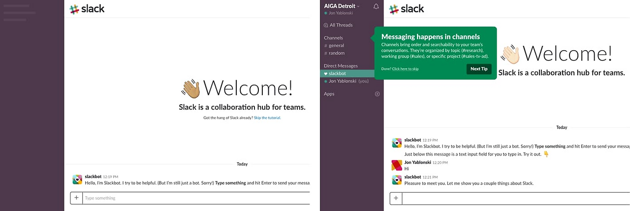 슬랙에서는 슬랙봇이라 명명한 로봇이 사용자와 대화를 나누면서 메시징 기능 사용법을 안내하는 방식으로 위험 부담을 낮춘다. 이때 메시지 입력 외에 다른 기능을 숨겨서 사용자의 부담을 덜어준다. 나머지 기능은 슬랙봇과 메시지를 주고받는 방법을 익힌 후에 점진적으로 소개한다.