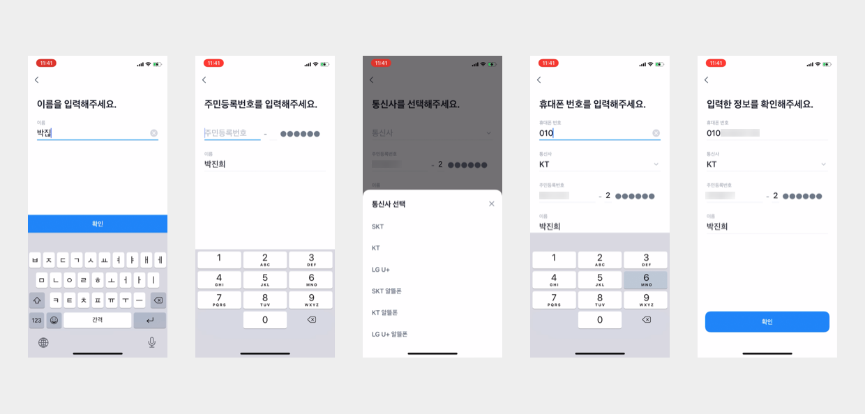 토스는 한 번에 하나의 선택지라는 UX 법칙을 아주 잘 지키는 대표적인 서비스이다. 회원가입에 필요한 정보를 한 번에 노출하고 입력을 받을 수도 있지만 입력 폼을 단계적으로 노출하여 시각부하와 인지부하를 줄였다. 이름, 주민등록번호, 통신사, 휴대폰 번호를 입력하는 폼이 한 번에 하나씩 주어지고 입력한 항목은 아래에서부터 쌓인다. 하나하나의 단계가 쉽게 넘어가기 때문에 사용자는 실제보다 거치는 단계를 짧다고 느끼는 효과를 얻는다. 화면을 나누어 운동부하가 늘더라도 시각부하와 인지부하가 줄어들기 때문에 전체적인 부하를 낮춘 셈이다. 또한 주민등록번호 앞자리처럼 정해진 숫자가 있는 경우에는 입력할 숫자가 채워지면 다음 입력할 필드로 커서를 이동 시켜 줌으로써 사용자의 불필요한 행동을 줄여주었다. 화면이 늘어나면서 높아진 운동부하를 줄이기 위한 노력으로 보인다.