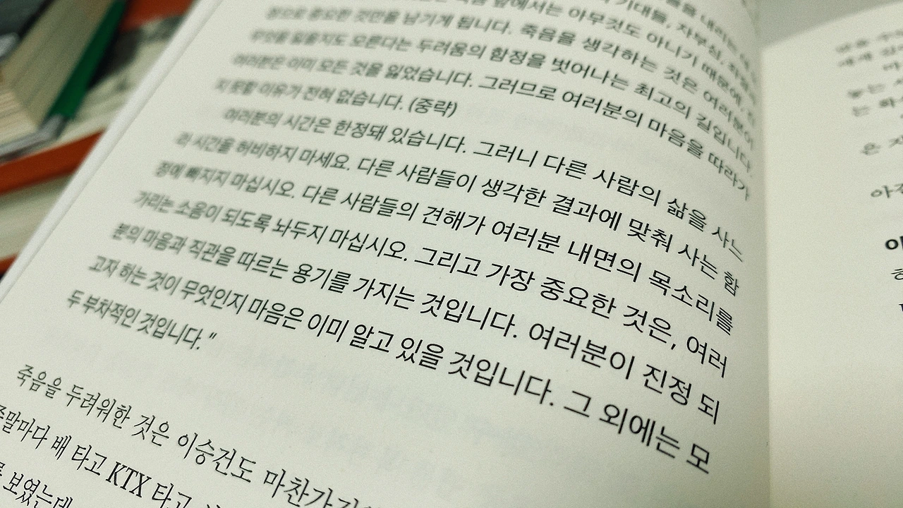 죽음을 생각하는 것은 여러분이 무엇을 잃을지도 모른다는 두려움의 함정을 벗어나는 최고의 길입니다. (중략) 여러분이 진정 되고자 하는 것이 무엇인지 마음은 이미 알고 있을 것입니다. 그 외에는 모두 부차적인 것입니다.