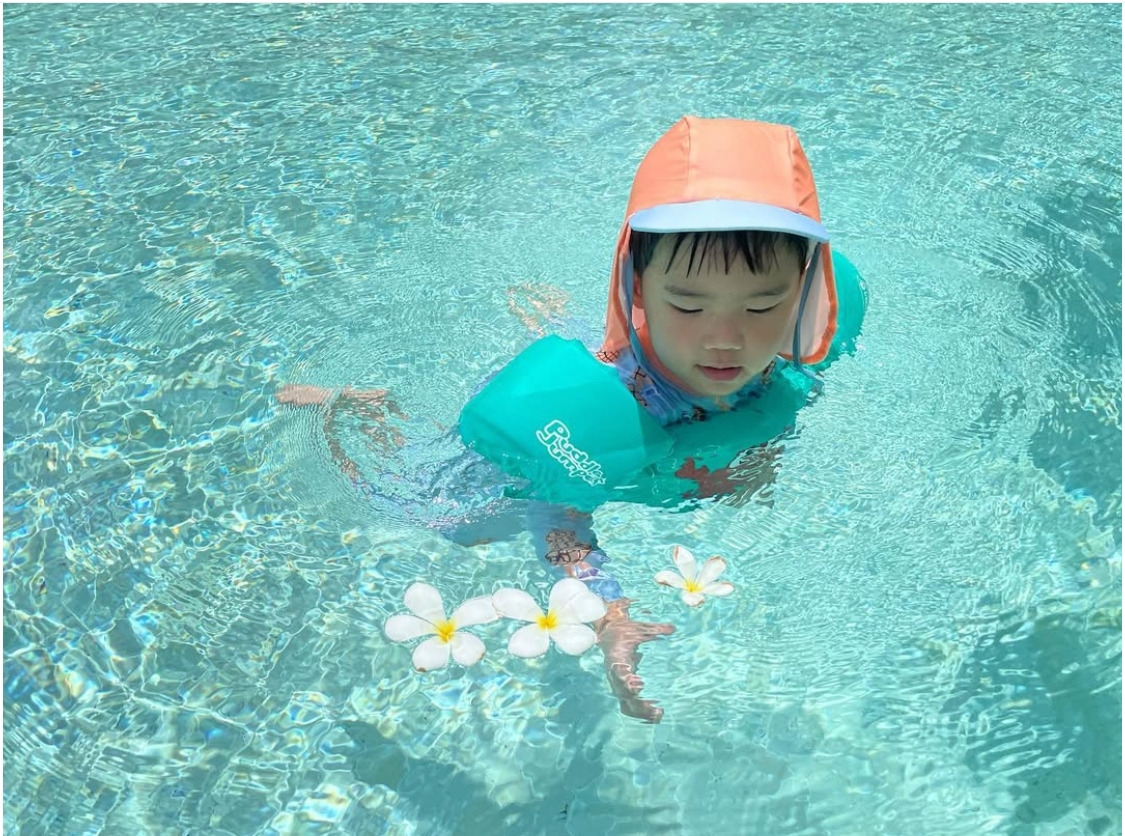 짜오프라야강이 보이는 호텔이었는데, 밤엔 칠흙같이 어두워서 잘 보이지 않았던 강물이 다음 날 아침에 보니 흙탕물이어서 놀랐던 기억이 난다. 둘째 날부터 본격적인 호캉스가 시작되었다. 호텔의 꽃인 조식으로 든든하게 배를 채우고, 수영 수영 노래를 부르는 꿀댕이를 데리고 누구보다 빠르게 수영장으로 돌진. 하지만 잠깐 방심하고 팔다리, 어깨 부분 선크림을 소홀히 발랐더니 2시간동안 혼이 빠져 물놀이하는 사이 내 살갗은 수영복 모양을 따라 빨갛게 타버렸다... 넘나 따갑고 쓰린 것... 꿀댕이는 온몸을 가린 수영복이라 다행이었다. 참 즐거웠는데,, 꿀댕이와의 추억을 쌓은 대신 얼굴의 주근깨를 얻었다.