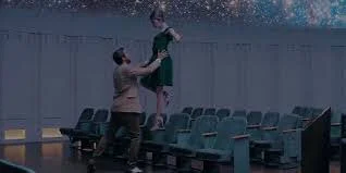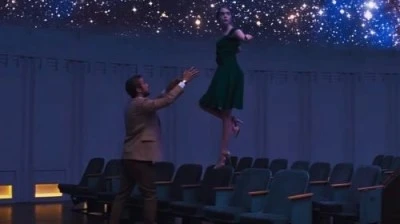 5년 후, 야자수와 눈부신 노을의 하늘은 현수막이었던 걸로 드러납니다. 스태프들이 환상적인 하늘 그림을 걷어내고, 현실 하늘 밑에 미아가 나타납니다. 미아는 세바스찬이 아닌 다른 사람과 결혼해 있는데다가 딸까지 있습니다. 믿어지지 않지만 현실입니다. 사계절 내내 따사로운 라라랜드는 어쩌면 사랑에 빠진 연인들의 시선으로 본 도시일지도 모르겠습니다. 사랑에 빠져 세상이 핑크 찬란한 노을빛으로 보이는 현상. '낮에 보니 조악한' 그리니치 천문대 속 가짜별빛 아래 두 사람이, 샤갈의 그림 속 연인처럼 땅에서 발이 떨어진 채, 우주 속에서 날아다니며 춤추듯 환상적으로 보였던 것처럼. 사랑이라는 우주 안에 다른 모든 것은 환상적인 색채로 페이드 아웃되고 단 둘만 남는 것처럼. '별의 도시'는 두 사람만을 위해 빛나던, 두 사람이 만든 환상일까요.