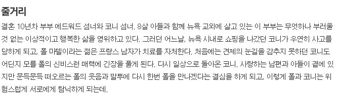 추천이 많기에 2002년 작품인 언페이스풀을 뒤늦게 보았다. 제목부터 헐리웃 버전의 사랑과 전쟁임을 암시하고 있다.