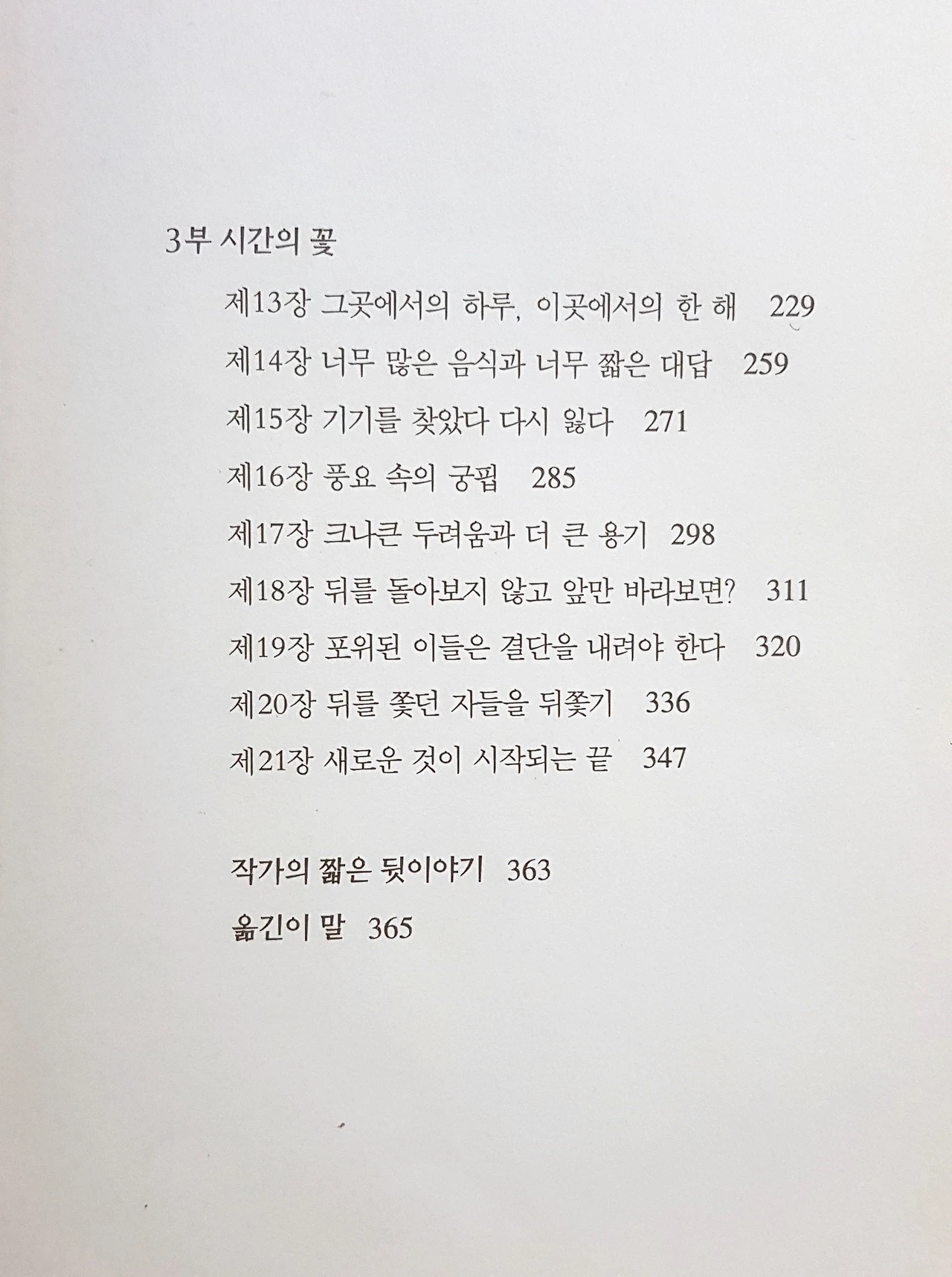 시간을 재기 위해서 달력과 시계가 있지만, 그것은 그다지 의미가 없다. 사실 누구나 잘 알고 있듯이 한 시간은 한없이 계속되는 영겁과 같을 수도 있고, 한 순간의 찰나와 같을 수도 있기 때문이다. 그것은 이 한 시간 동안 우리가 무슨 일을 겪는가에 달려 있다. 시간은 삶이며, 삶은 우리 마음속에 있는 것이니까. -77쪽