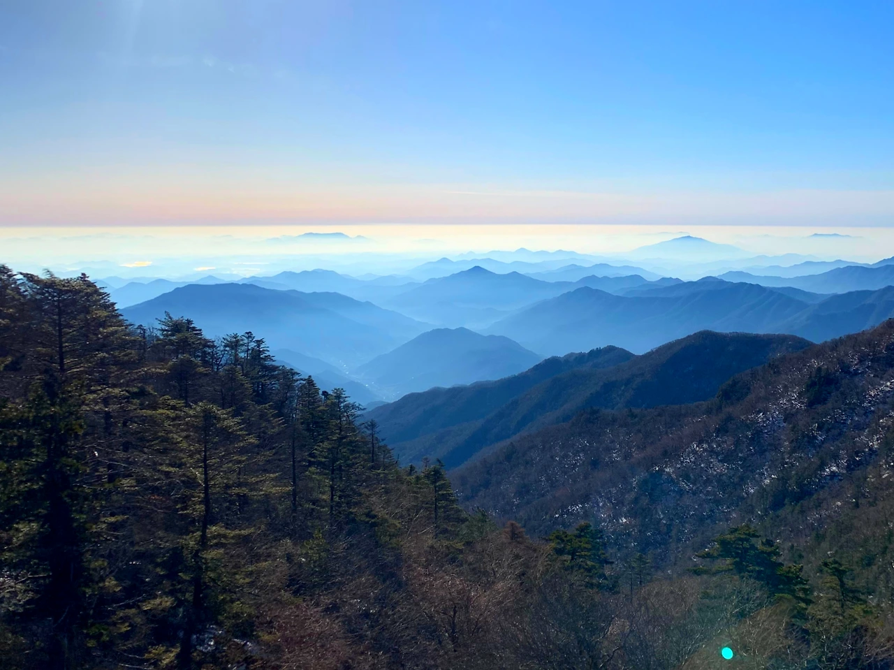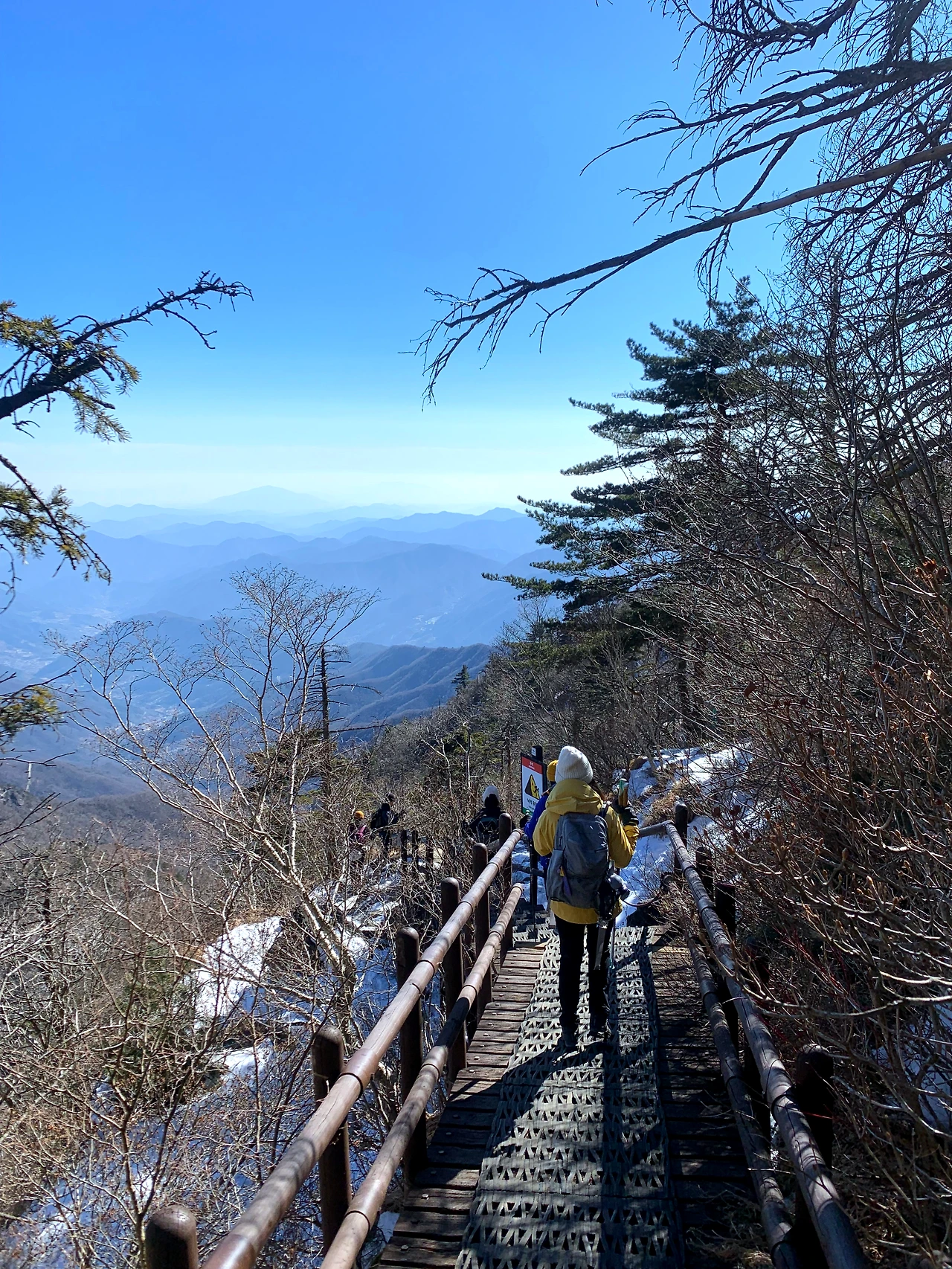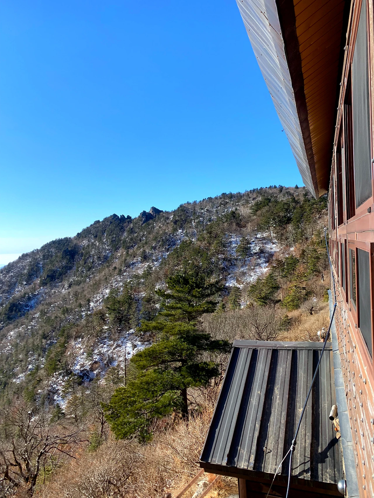 잘 정비된 돌계단에 최근 지어진 계단까지 더해져 정상까지 딱히 험한 구간은 없다. 다만 대피소 도착 30~40분 전에는 눈으로 뒤덮이거나 얼어있는 구간이 많아 결국 아이젠을 꺼내 착용했다. 아이젠만 착용하면 훨씬 안전할 텐데 가방에서 아이젠을 꺼내 꼈다 뺐다 하는 일이 왜 이리 번거로운지... 그래도 부상 없는 산행을 위해 조금의 번거로움을 참고 다 같이 꼈다. 이제 나올 때가 되지 않았나.. 싶을 때쯤 장터목 대피소가 보인다. 대피소 너머로 보이는 뷰가 참 좋았다. 대피소 내에서는 아이젠 착용이 금지되어 있어 아이젠을 빼며 뷰를 감상하고 들어갔다.