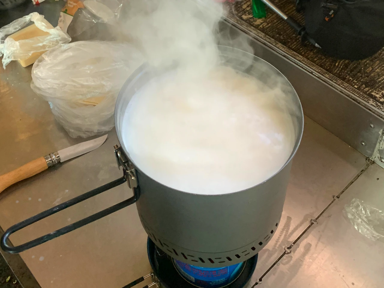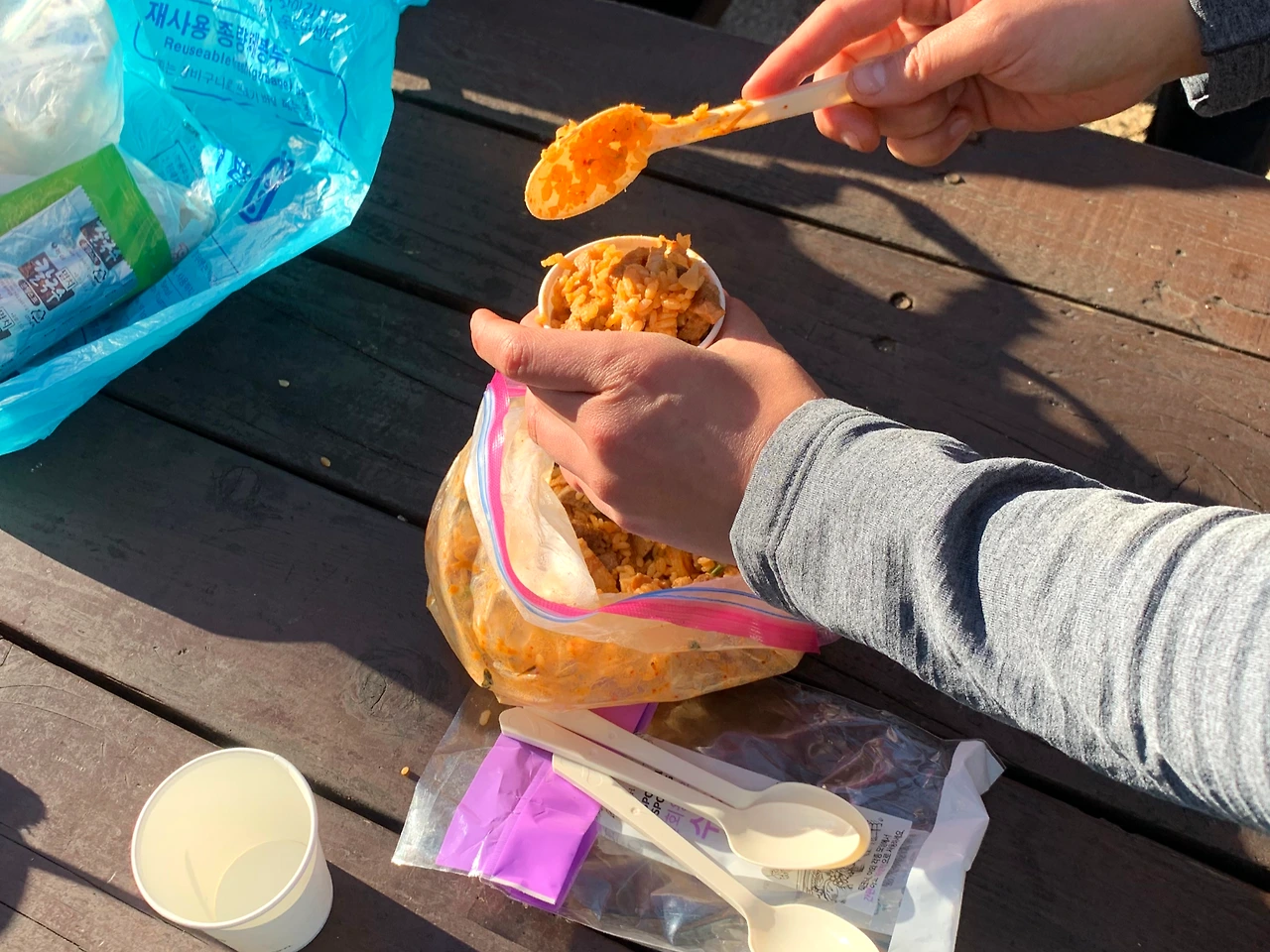 요리를 준비하고, 굽고, 끓이고, 또 정리하는 시간까지 더해져 두 시간이라는 시간이 대피소에서 후딱 지나갔다. 고기와 밥, 김치, 파, 마늘 등이 남아 미리 굽고 볶아 식힌 후 지퍼백에 보관했다. 하산 도중 허기가 지면 다 같이 먹을 수 있는 볶음밥이 완성되었다. 그리고 그 볶음밥의 대부분은 내 뱃속으로 들어갔다고 한다..