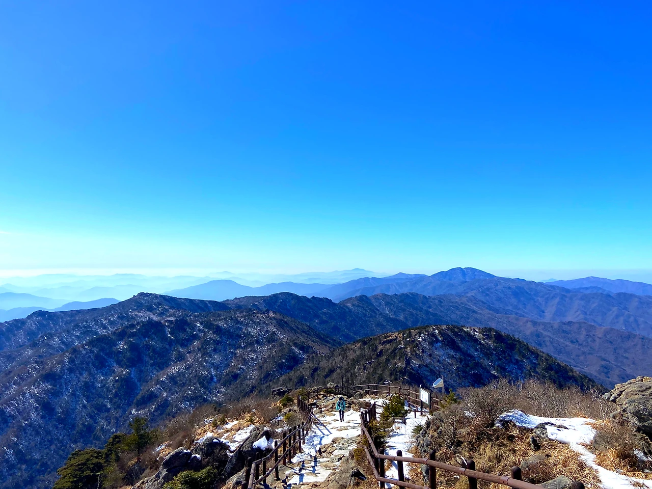 이제 슬슬 채비를 끝내고 천왕봉으로 오르기 시작한다. 애초에 시간을 여유롭게 잡아 급할 건 없지만, 너무 지체되면 하산 시 야등을 해야 할 수도 있기에 움직이기로 했다. 설악산 대비 힘들지는 않았지만 정상에 다다를수록 가방이 점점 무겁게 느껴졌다. 대피소에서 생각보다 물이 충분해 비우지 못했는데 하산까지 파워에이드 한 병으로 버텼다. 여럿이 오는 산행이 아니라면 겨울엔 역시 물은 적당히 챙겨야겠다.