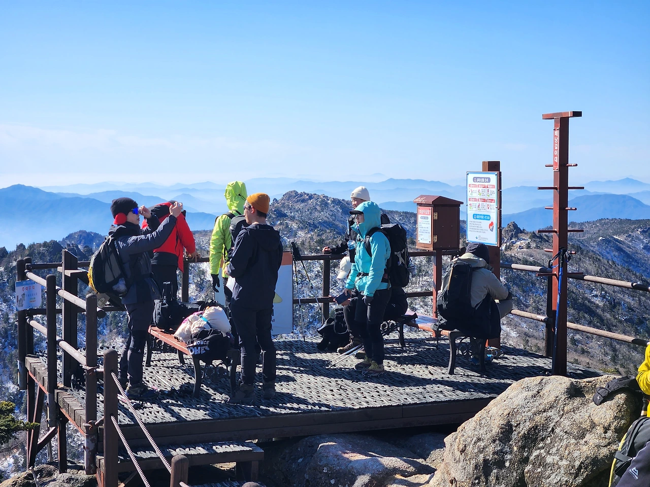 처음 올라왔을 때는 한적했는데 사람들이 점점 많아져 아쉬웠다. 올라오자마자 빨리 사진을 찍었어야 하는데, 찍다 보니 뒤에서 재촉하기 시작. 흑. 그래도 주말치고는 없었던 편이라 몇 번 줄을 선 끝에 하나는 건졌다. 한 가지 놀라웠던 점은 정상석 바로 앞이 절벽이라 사진 촬영 도중 발을 헛디디거나 중심을 잃으면 다칠 수도 있어 보였다.