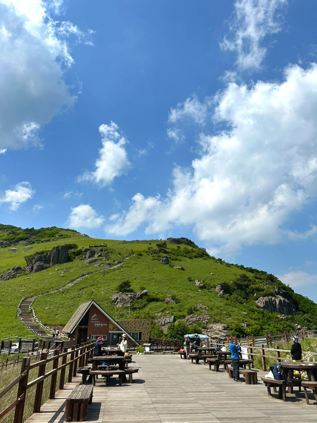 휴게소 데크 위 테이블에 앉아 풍경을 감상하며 챙겨 온 행동식을 먹었다. 크게 기대 안 했는데 너무 행복했다. 영남 알프스 완등을 하면 3만 명에게 선착순으로 완등서를 주는데 이날 이미 2만 8천 명이 넘어서인지 사람도 별로 없었다. 바람은 살랑살랑 불었고 다 먹은 후 휴게소 아이스크림으로 후식까지 해결하니 완벽 그 자체였다. 보통 산에 있는 화장실이 깨끗할 거라 기대하기는 어려운데 간월재 휴게소 화장실은 지어진지 얼마 되지 않아서 그런지 일반 건물 화장실만큼이나 깨끗했다. 휴게소에 머무르며 우리는 약 두 시간이 넘는 시간 동안 먹고 사진을 찍는 데 시간을 보냈다.