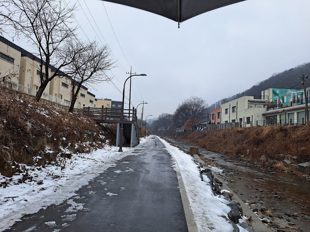 미끄러운 길을 핑계로 포기하고 돌아가려고 할 때쯤이다. 앞에서 걸어오던 할아버지가 지나가며 나에게 말했다. "저 위에 염화칼슘 뿌려서 길 싹 녹았어요". 내가 어딜 가는지 알고 말씀하신 걸까? 설령 내가 다니는 산책로라고 해도 그 두꺼운 얼음길이 녹았을 리는 없을 텐데.. 그래도 말 한마디 건네주신 게 감사해서 산책을 이어갔다. 정말로 녹았는지 확인만 하고 가자고 생각했다.