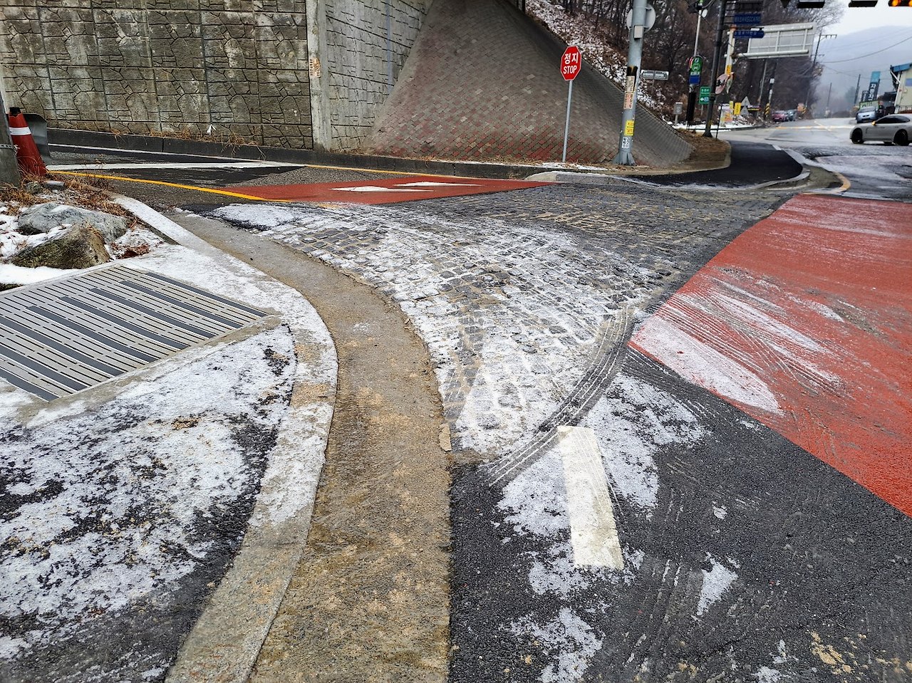 내가 포기하고 돌아가기로 생각했던 곳은 약간은 경사진 도로다. 고작 몇 미터 하찮은 경사로지만 산책을 포기하게 만들기엔 충분했다. 그런데 도착해 보니 길 위의 얼음들은 모두 녹아있었다.
