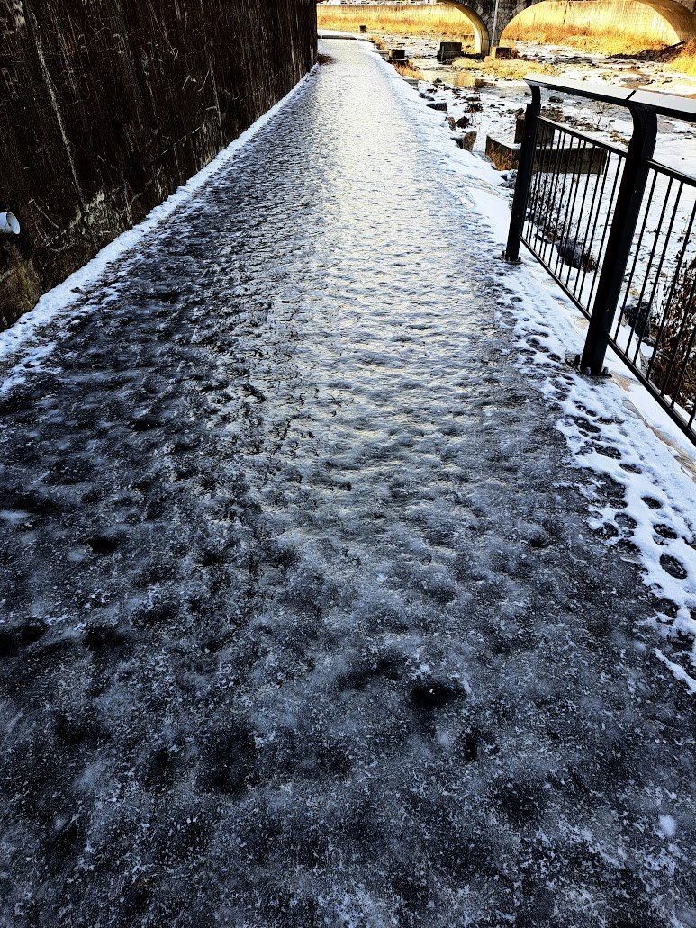 1월 16일은 전날 내렸던 많은 눈들이 녹았다가 다시 얼어서 길 전체가 눈과 얼음으로 뒤덮였다. 낮엔 살짝 녹기까지 해서 난 몇 번이고 미끄러져 넘어지고 말았다. 머릿속에선 '내일은 산책을 포기하자. 이건 핑계가 아니야. 다칠 것 같아!'라며 포기를 위한 핑계를 만들어내고 있었다.