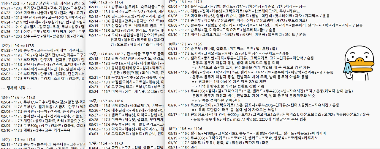 제가 실패했던 다이어트 기록 일부입니다. 기록으로 식생활에 잘못된 부분도 알 수 있었고 다이어트 후반에 의지력이 급격히 떨어지는 것도 확인할 수 있었습니다. 특히, 장기간 다이어트에서 갈수록 포만감과 단음식에 대한 갈망으로 식단이 급격히 무너지는 것을 확인할 수 있었습니다.